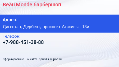 Beau Monde, барбершоп по адресу Дагестан, Дербент, проспект Агасиева, 13и в дальнейшем Организация, размещена в следующих категориях: