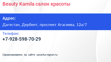 Beauty Kamila, салон красоты по адресу Дагестан, Дербент, проспект Агасиева, 12а/7 в дальнейшем Организация, размещена в следующих категориях: