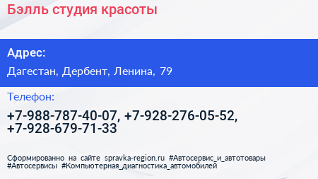 Бэлль, студия красоты по адресу Дагестан, Дербент, Ленина, 79 в дальнейшем Организация, размещена в следующих категориях: