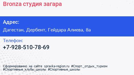 Bronza, студия загара по адресу Дагестан, Дербент, Гейдара Алиева, 8а в дальнейшем Организация, размещена в следующих категориях: