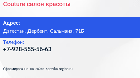 Couture, салон красоты по адресу Дагестан, Дербент, Сальмана, 71Б в дальнейшем Организация, размещена в следующих категориях:
