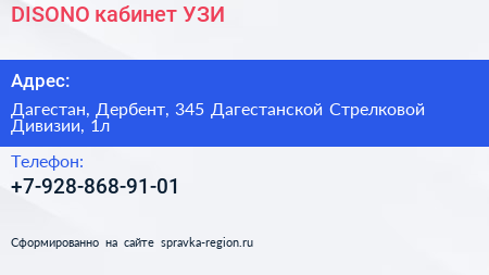 DISONO, кабинет УЗИ по адресу Дагестан, Дербент, 345 Дагестанской Стрелковой Дивизии, 1л в дальнейшем Организация, размещена в следующих категориях: