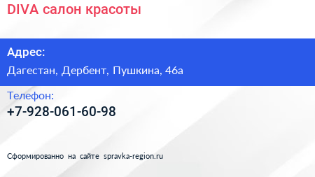 DIVA, салон красоты по адресу Дагестан, Дербент, Пушкина, 46а в дальнейшем Организация, размещена в следующих категориях: