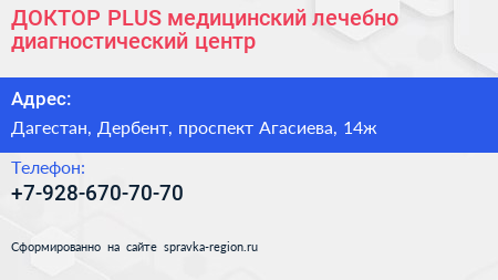ДОКТОР PLUS, медицинский лечебно-диагностический центр по адресу Дагестан, Дербент, проспект Агасиева, 14ж в дальнейшем Организация, размещена в следующих категориях: