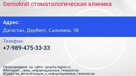 Demokrat, стоматологическая клиника по адресу Дагестан, Дербент, Сальмана, 58 в дальнейшем Организация, размещена в следующих категориях: