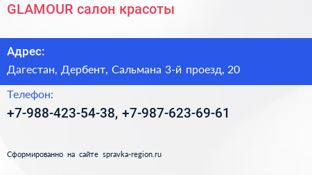 GLAMOUR, салон красоты по адресу Дагестан, Дербент, Сальмана 3-й проезд, 20 в дальнейшем Организация, размещена в следующих категориях: