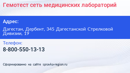 Гемотест, сеть медицинских лабораторий по адресу Дагестан, Дербент, 345 Дагестанской Стрелковой Дивизии, 19 в дальнейшем Организация, размещена в следующих категориях:
