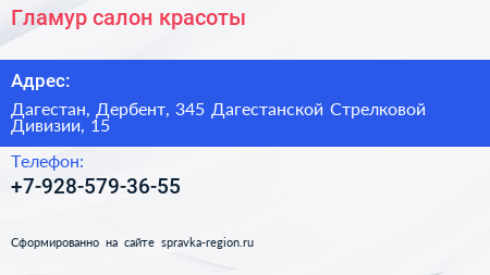 Гламур, салон красоты по адресу Дагестан, Дербент, 345 Дагестанской Стрелковой Дивизии, 15 в дальнейшем Организация, размещена в следующих категориях: