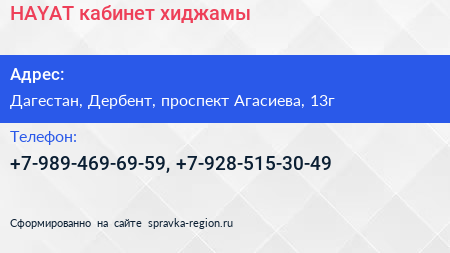 HAYAT, кабинет хиджамы по адресу Дагестан, Дербент, проспект Агасиева, 13г в дальнейшем Организация, размещена в следующих категориях: