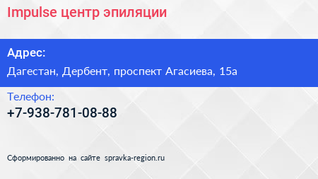Impulse, центр эпиляции по адресу Дагестан, Дербент, проспект Агасиева, 15а в дальнейшем Организация, размещена в следующих категориях: