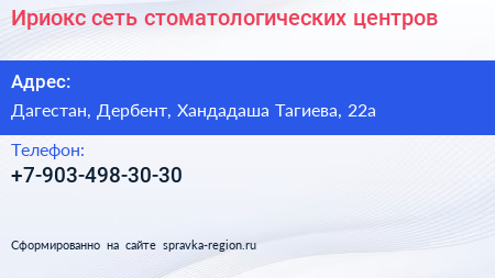 Ириокс, сеть стоматологических центров по адресу Дагестан, Дербент, Хандадаша Тагиева, 22а в дальнейшем Организация, размещена в следующих категориях:
