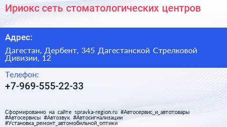 Ириокс, сеть стоматологических центров по адресу Дагестан, Дербент, 345 Дагестанской Стрелковой Дивизии, 12 в дальнейшем Организация, размещена в следующих категориях: