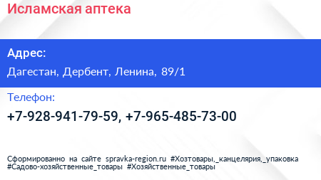 Исламская аптека по адресу Дагестан, Дербент, Ленина, 89/1 в дальнейшем Организация, размещена в следующих категориях: