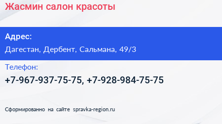 Жасмин, салон красоты по адресу Дагестан, Дербент, Сальмана, 49/3 в дальнейшем Организация, размещена в следующих категориях: