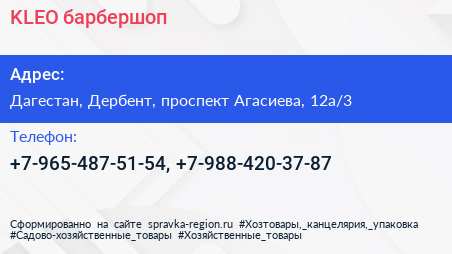 KLEO, барбершоп по адресу Дагестан, Дербент, проспект Агасиева, 12а/3 в дальнейшем Организация, размещена в следующих категориях: