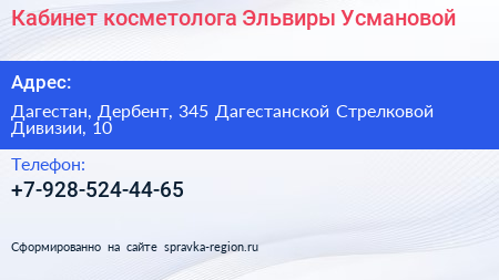 Кабинет косметолога Эльвиры Усмановой по адресу Дагестан, Дербент, 345 Дагестанской Стрелковой Дивизии, 10 в дальнейшем Организация, размещена в следующих категориях: