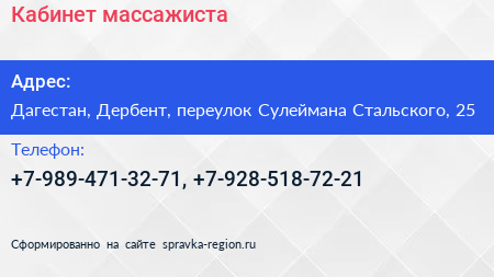 Кабинет массажиста по адресу Дагестан, Дербент, переулок Сулеймана Стальского, 25 в дальнейшем Организация, размещена в следующих категориях: