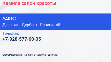 Камила, салон красоты по адресу Дагестан, Дербент, Ленина, 68 в дальнейшем Организация, размещена в следующих категориях: