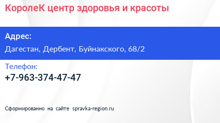 КоролеК, центр здоровья и красоты по адресу Дагестан, Дербент, Буйнакского, 68/2 в дальнейшем Организация, размещена в следующих категориях: