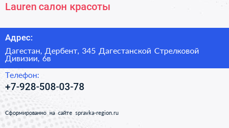 Lauren, салон красоты по адресу Дагестан, Дербент, 345 Дагестанской Стрелковой Дивизии, 6в в дальнейшем Организация, размещена в следующих категориях: