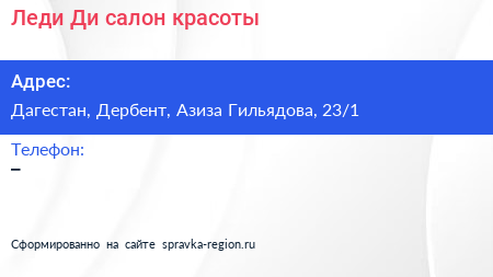Леди Ди, салон красоты по адресу Дагестан, Дербент, Азиза Гильядова, 23/1 в дальнейшем Организация, размещена в следующих категориях:
