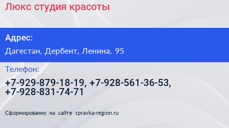 Люкс, студия красоты по адресу Дагестан, Дербент, Ленина, 95 в дальнейшем Организация, размещена в следующих категориях: