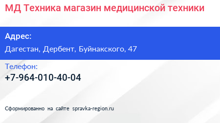 МД Техника, магазин медицинской техники по адресу Дагестан, Дербент, Буйнакского, 47 в дальнейшем Организация, размещена в следующих категориях: