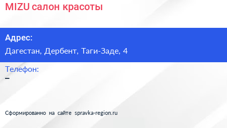 MIZU, салон красоты по адресу Дагестан, Дербент, Таги-Заде, 4 в дальнейшем Организация, размещена в следующих категориях:
