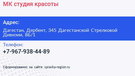 МК, студия красоты по адресу Дагестан, Дербент, 345 Дагестанской Стрелковой Дивизии, 8Б/1 в дальнейшем Организация, размещена в следующих категориях: