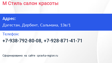 М.Стиль, салон красоты по адресу Дагестан, Дербент, Сальмана, 13в/1 в дальнейшем Организация, размещена в следующих категориях: