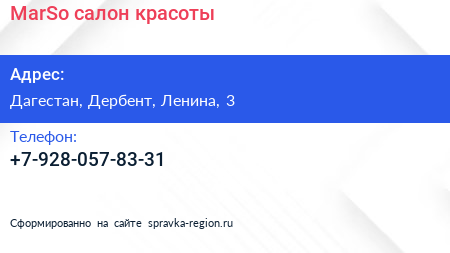 MarSo, салон красоты по адресу Дагестан, Дербент, Ленина, 3 в дальнейшем Организация, размещена в следующих категориях: