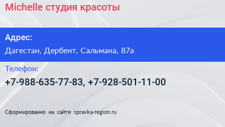 Michelle, студия красоты по адресу Дагестан, Дербент, Сальмана, 87а в дальнейшем Организация, размещена в следующих категориях: