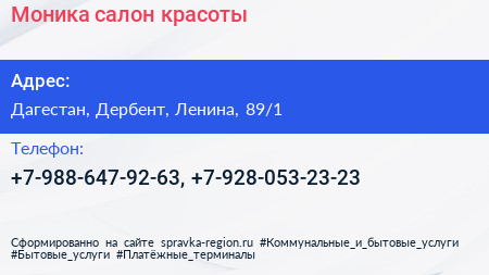Моника, салон красоты по адресу Дагестан, Дербент, Ленина, 89/1 в дальнейшем Организация, размещена в следующих категориях: