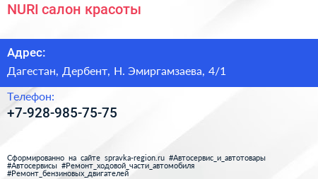 NURI, салон красоты по адресу Дагестан, Дербент, Н. Эмиргамзаева, 4/1 в дальнейшем Организация, размещена в следующих категориях: