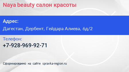 Naya beauty, салон красоты по адресу Дагестан, Дербент, Гейдара Алиева, 6д/2 в дальнейшем Организация, размещена в следующих категориях: