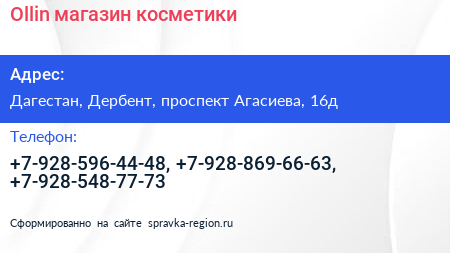Ollin, магазин косметики по адресу Дагестан, Дербент, проспект Агасиева, 16д в дальнейшем Организация, размещена в следующих категориях: