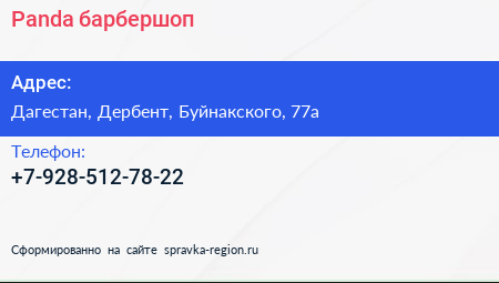 Panda, барбершоп по адресу Дагестан, Дербент, Буйнакского, 77а в дальнейшем Организация, размещена в следующих категориях: