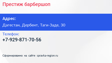 Престиж, барбершоп по адресу Дагестан, Дербент, Таги-Заде, 30 в дальнейшем Организация, размещена в следующих категориях: