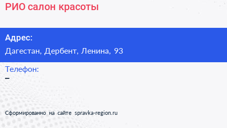 РИО, салон красоты по адресу Дагестан, Дербент, Ленина, 93 в дальнейшем Организация, размещена в следующих категориях: