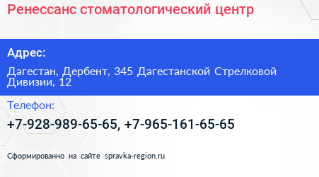 Ренессанс, стоматологический центр по адресу Дагестан, Дербент, 345 Дагестанской Стрелковой Дивизии, 12 в дальнейшем Организация, размещена в следующих категориях: