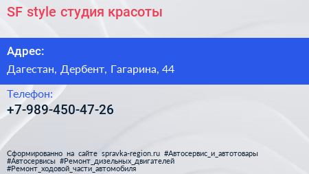 SF style, студия красоты по адресу Дагестан, Дербент, Гагарина, 44 в дальнейшем Организация, размещена в следующих категориях: