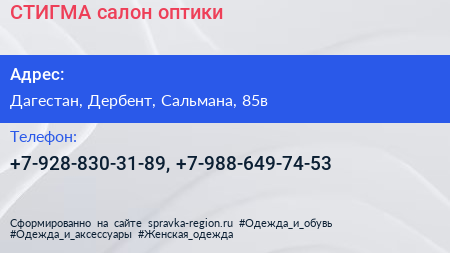 СТИГМА, салон оптики по адресу Дагестан, Дербент, Сальмана, 85в в дальнейшем Организация, размещена в следующих категориях: