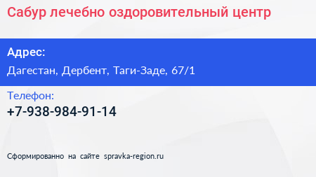 Сабур, лечебно-оздоровительный центр по адресу Дагестан, Дербент, Таги-Заде, 67/1 в дальнейшем Организация, размещена в следующих категориях: