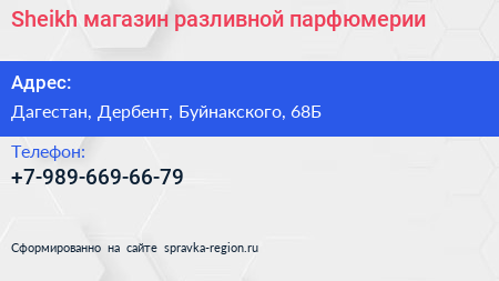 Sheikh, магазин разливной парфюмерии по адресу Дагестан, Дербент, Буйнакского, 68Б в дальнейшем Организация, размещена в следующих категориях: