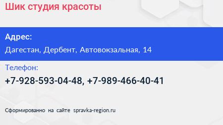 Шик, студия красоты по адресу Дагестан, Дербент, Автовокзальная, 14 в дальнейшем Организация, размещена в следующих категориях:
