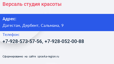 Версаль, студия красоты по адресу Дагестан, Дербент, Сальмана, 9 в дальнейшем Организация, размещена в следующих категориях: