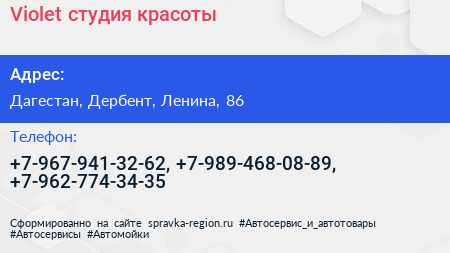 Violet, студия красоты по адресу Дагестан, Дербент, Ленина, 86 в дальнейшем Организация, размещена в следующих категориях: