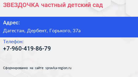 ЗВЕЗДОЧКА, частный детский сад по адресу Дагестан, Дербент, Горького, 37а в дальнейшем Организация, размещена в следующих категориях: