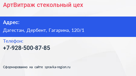 АртВитраж, стекольный цех по адресу Дагестан, Дербент, Гагарина, 120/1 в дальнейшем Организация, размещена в следующих категориях:
