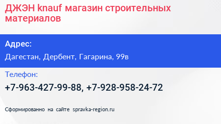 ДЖЭН knauf, магазин строительных материалов по адресу Дагестан, Дербент, Гагарина, 99в в дальнейшем Организация, размещена в следующих категориях: